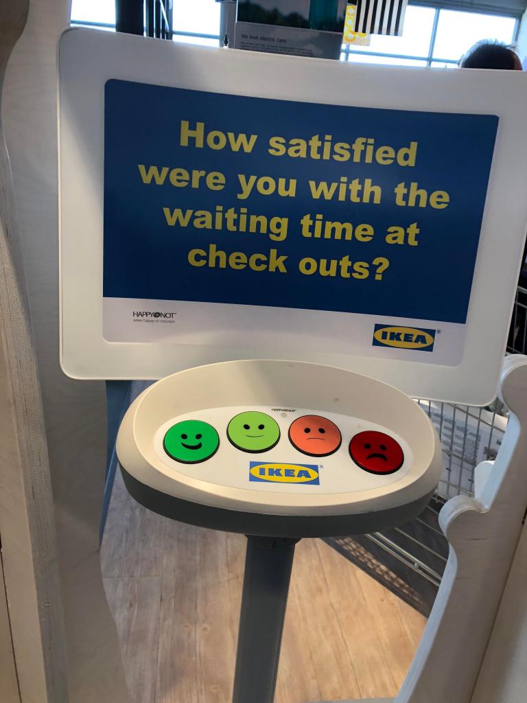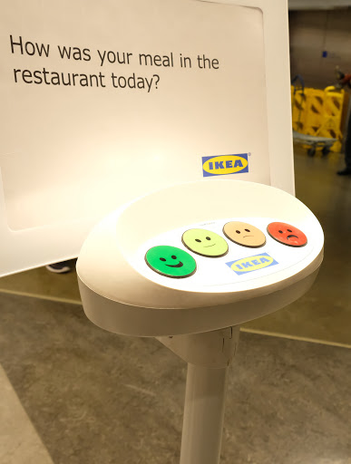 A Finnish company called, HappyOrNot, created terminals that were freestanding with four different buttons that expressed different emoticons with a corresponding color (angry face is dark red). These terminals were placed in different businesses with a question so that when a customer walked by it they can answer it by taping one of the buttons.