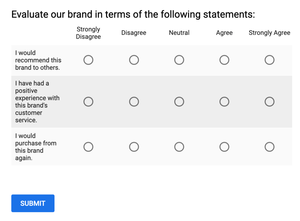 This method can use different scales that ultimately yields the same results. When it appears on a screen or on paper depending on where it shows up, always has questions on one side or on the top and then next to or under each question is a scale. The amount of questions rarely ever changes depending on what the company is looking for, but 10 is the most that this method uses. This scale can either be numbered one through five or has five spaces. Then the number one or the first space means that the user strongly disagrees with the question, while the number five or space five being that you strongly agree with the question.
