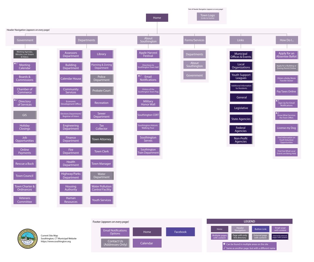 Before I even began creating the site map, I did my research and pretended that I was a user for a little bit on Southington’s municipal website. I clicked through every page, link, button, and looked at any information that was there, while I took notice of the content the pages provided, how long it took to get to different places on the site, and how the site was organized overall. While this took some time, it was well worth it as it was very informative when it came time to create the site map for how it currently is. I didn’t include every single page, link, piece of content, or even external pages because the website is very large and there was no way I would be able to get everything. Instead, I focused on enough to get a good idea of how the site flowed and how it was organized for the users so far.