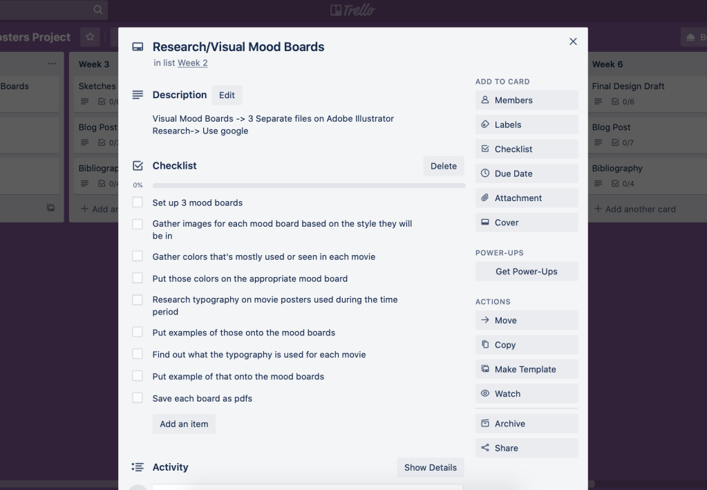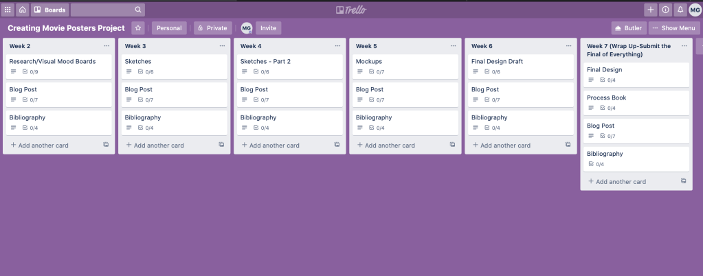 Staying on track and getting tasks done can be difficult when there are so many distractions and other tasks that takes the attention away from what truly needs to get done. For me, setting myself a schedule week by week helped to keep me focus and attention to completing the task while making sure to be as creative and unique as possible. Trello has been a huge part in helping me achieve great designs while staying on track.