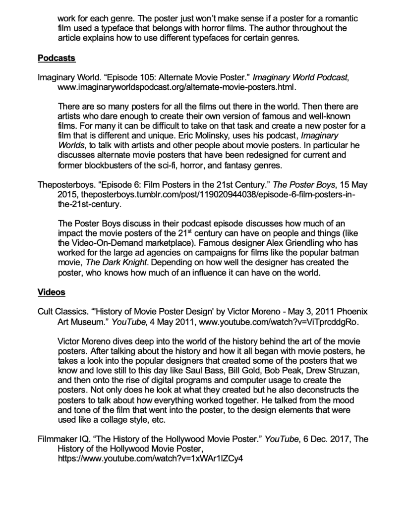 As I did some preliminary research to do the project proposal, further and more in-depth research needed to be completed. Doing more research strengthened my knowledge on film posters and allowed me to understand more of how all the pieces are put together to create the posters we all see and love. My research included websites, articles, books, blogs, and even videos. At one point I was even watching a video where a real designer who has created some of the popular and well known movie posters. Throughout the research process I was able discover the patterns and trends within the different genres and so much more. In order to keep track of every piece of research that I have accumulated a bibliography was created along with a description of the source in case I wanted to refer back to it during the creation process.
